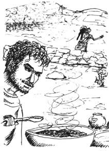 Jákób szelíd sátorlakó, de nem sátorbanülő. Naphosszat a nyáj körül szorgoskodik, ahogy egy jó pásztorember teszi. És az ételek elkészítéséhez is kitűnően ért. Különösen a lencsefőzelékhez. Most is éppen azt főz, amikor fáradtan megérkezik a mezőről Ézsau, a bátyja, s enni kér az ételből. Jákób azonban nemcsak szelíd, hanem (mint neve mutatja) csaló is. Kihasználva a helyzetet, elkéri Ézsautól az elsőszülöttségi jogát, aki éhesen lemond róla.